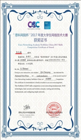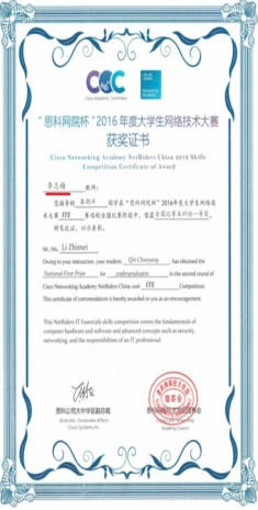 指导学生获各类省部级以上学科竞赛奖19项,其中获得思科网院杯大学生网络技术大赛全国比赛本科组一等奖2项、二等奖2项、三等奖2项,蓝桥杯全国竞赛三等奖1项。