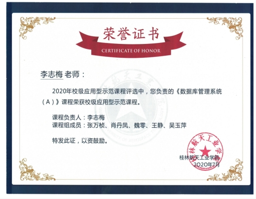 荣获自治区教育教学改革工程项目10项,校级教改教研和教学质量工程项目12项,本科优秀教学质量奖1项,校级重点课程2门,出版国家级教材2部,公开发表教改论文24篇。获得教育教学信息化比赛全国三等奖1项、广西区比赛优秀奖3项,全国多媒体软件大赛优秀奖1项,广西教育教学软件应用大赛二等奖1项。获得校级教学成果一等奖1项、三等奖3项。